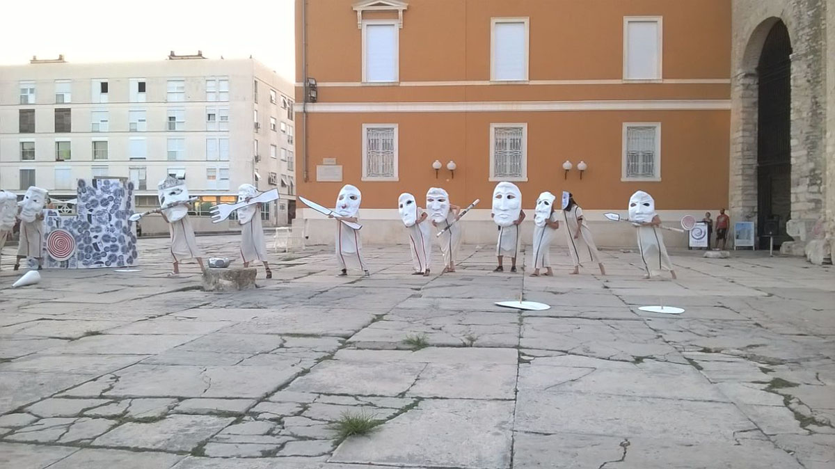 Artist Residency at Zadar Snova International Festival of Contemporary Theatre, Croatia. Installation and street performance. Adaptation of a play by Alfred Jarry: “King Ubu.” Production included a series of workshops for the local community of art and theatre enthusiasts creating costumes and props for the final street performance.